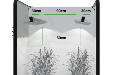 Wir haben die EVO 5-150 für Pflanzflächen mit einer Tiefe von 150cm entwickelt. Hierdurch kommen Sie bei der Verwendung von zwei Leuchten in einem Zelt von 1,5×1,5m an die maximal verwertbare Beleuchtungsintensität. 915µmol/s erzeugen viel Licht bei sparsamen 340W Leistung. Durch die Verwendung von zwei Leuchten haben Sie in der Mitte noch ausreichend Platz im Zelt, um dort die Lüftung zu installieren. Hierdurch können Sie die eingeschränkte Höhe in Pflanzzelten optimal ausnutzen. Die Sekundäroptik, als auch die Möglichkeit den Winkel der Leuchte zu verändern, um dadurch die Abstrahlcharakteristik anzupassen, erzeugt höchste Beleuchtungswerte und eine sehr gleichmäßige Ausleuchtung Ihrer Pflanzfläche.